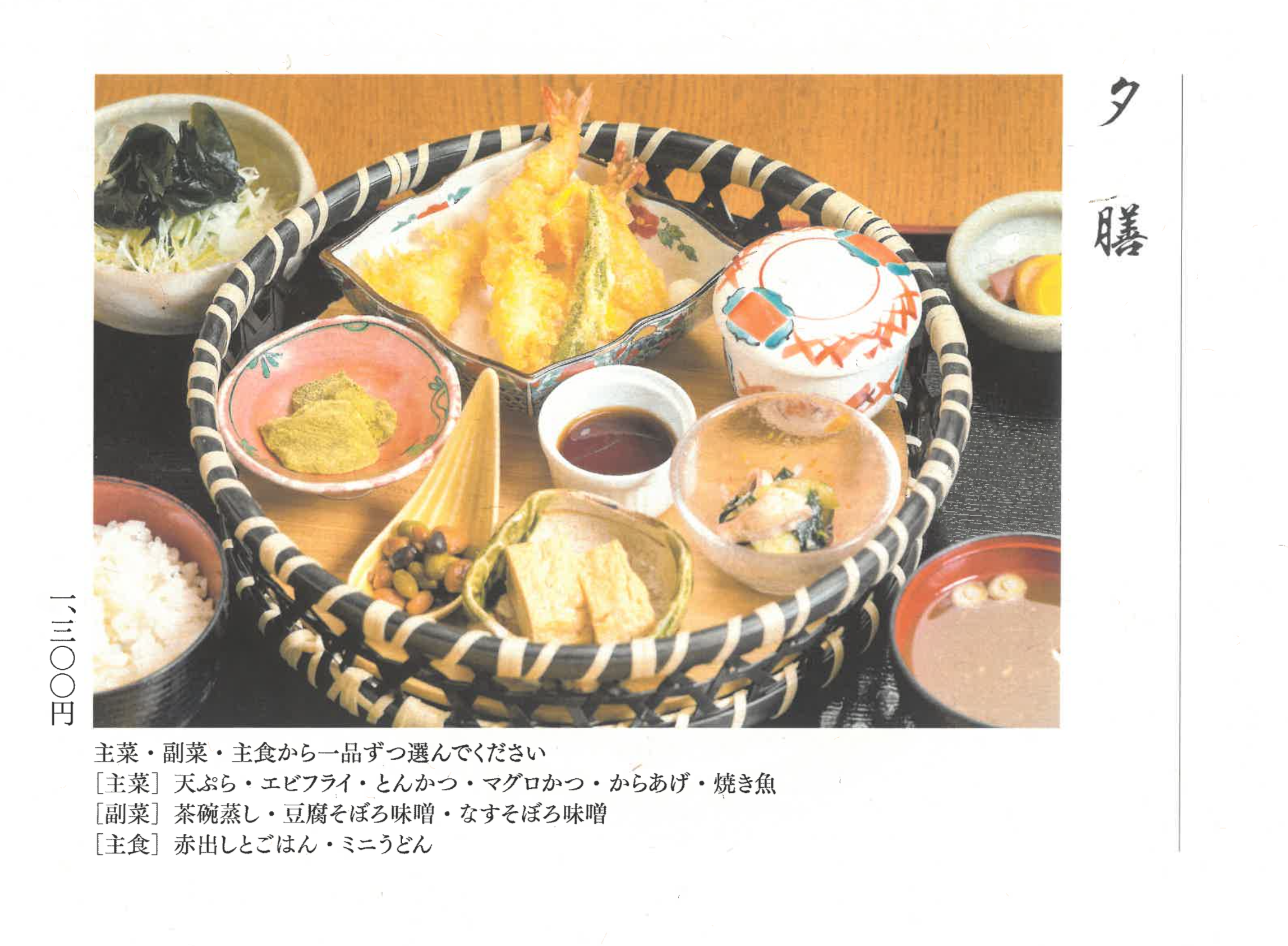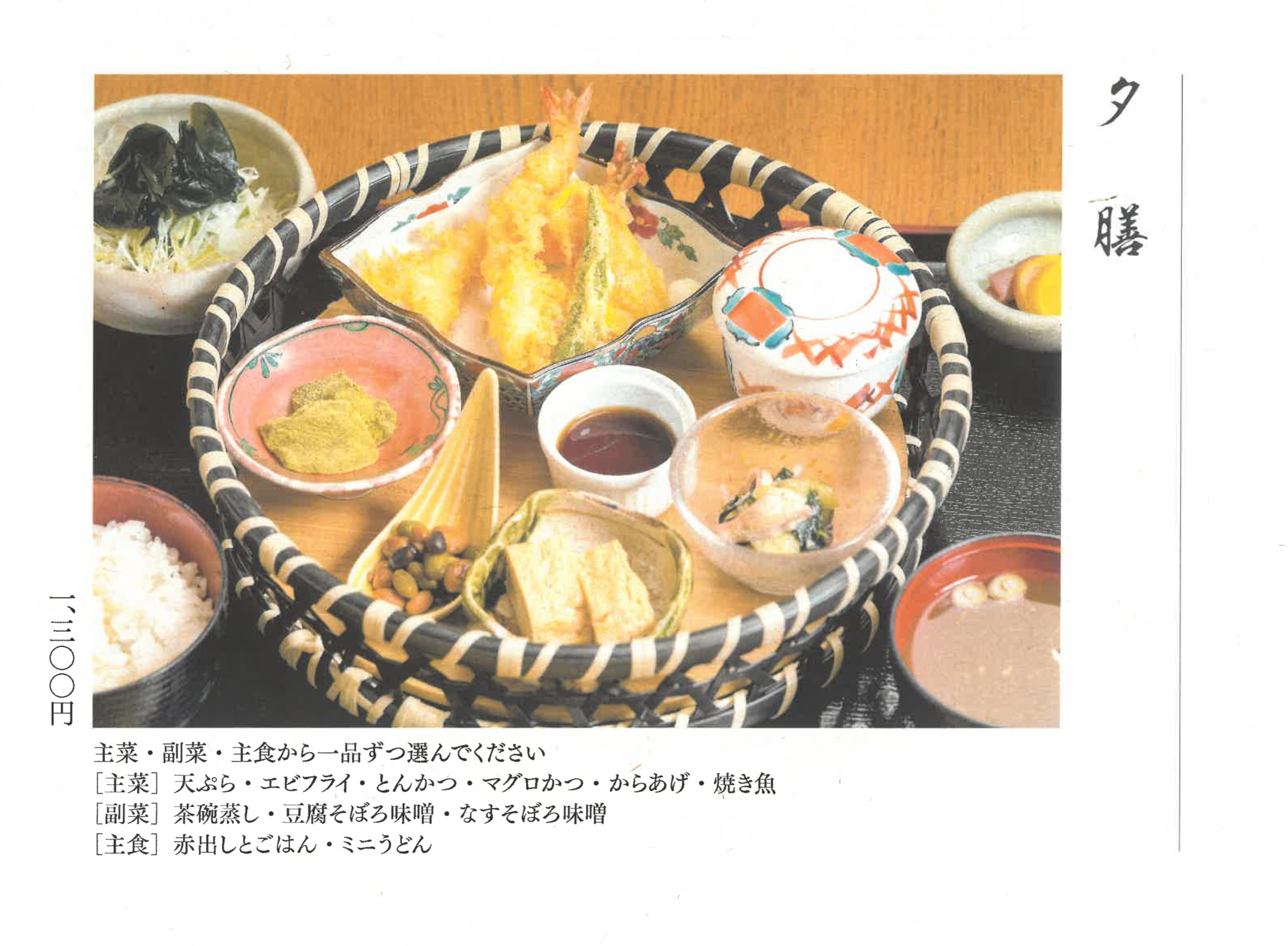 ※写真をクリックすると拡大表示します ※価格はすべて税込価格です。 夕 膳 主菜・副菜・主食から一品づつ選んでください 【主菜】天ぷら・エビフライ・とんかつ・まぐろカツ・からあげ・焼き魚 【副菜】茶碗蒸し・豆腐そぼろ味噌・なすそぼろ味噌 【主食】赤出しとご飯・ミニうどん 和風膳 小鉢・お造り・茶碗蒸し・天ぷら・茄子みそ・赤出し・ご飯・漬物・デザート(九品) 花 膳 小鉢・お造り・焼き魚・茶碗蒸し・出し巻き・天ぷら・ご飯・漬物・赤出し・デザート(十品) プリプリエビマヨ 天ぷら盛り合わせ 和牛ホルモン うま辛ラーメン あんかけカニ玉風 豆腐そぼろ味噌 チーズ揚げ盛り合わせ 洋風出し巻きトマト 出し巻きのりチーズ ひとくちデザート きまぐれデザート ジェラートデザート デザートコース English Page ▶︎