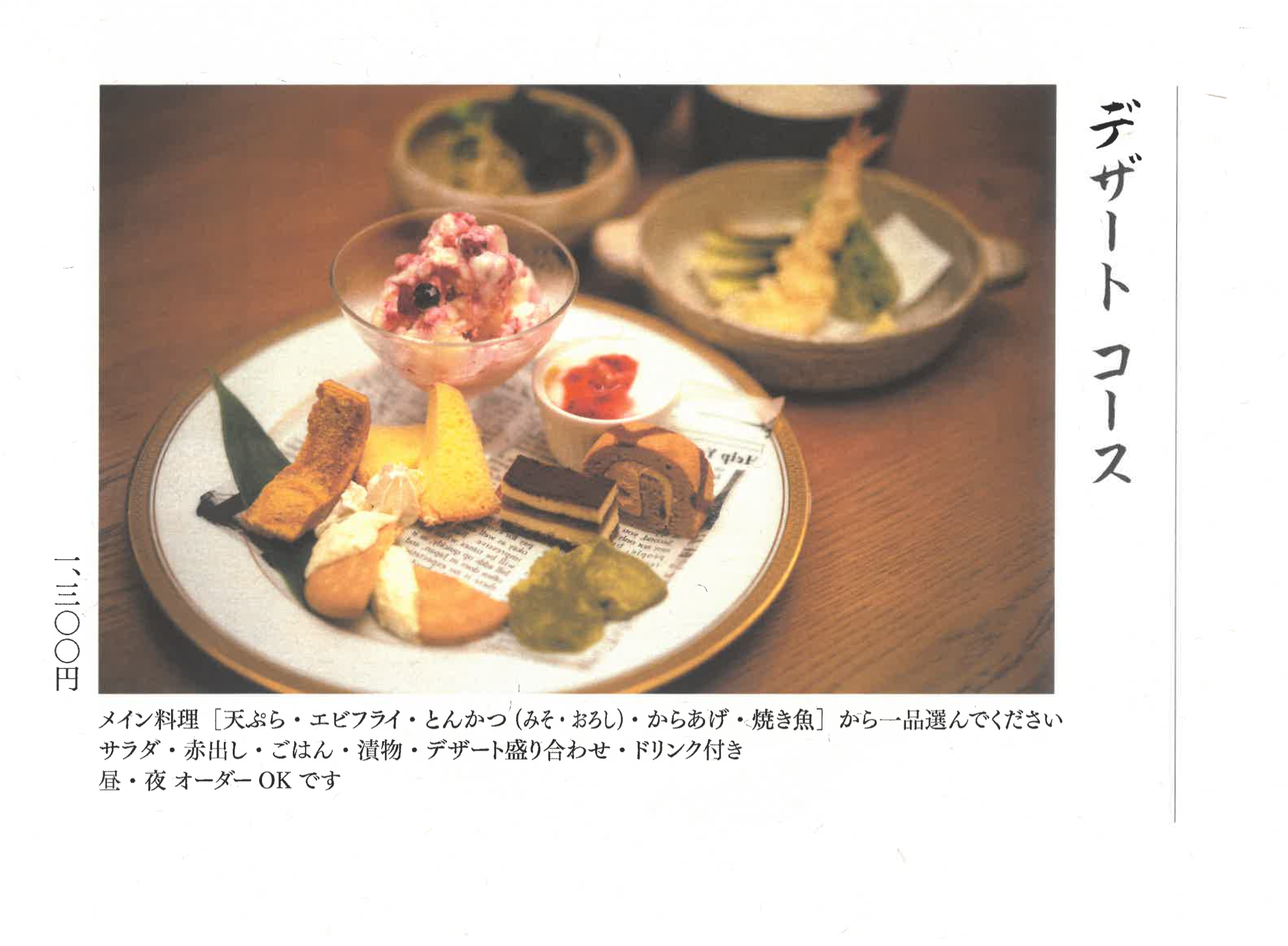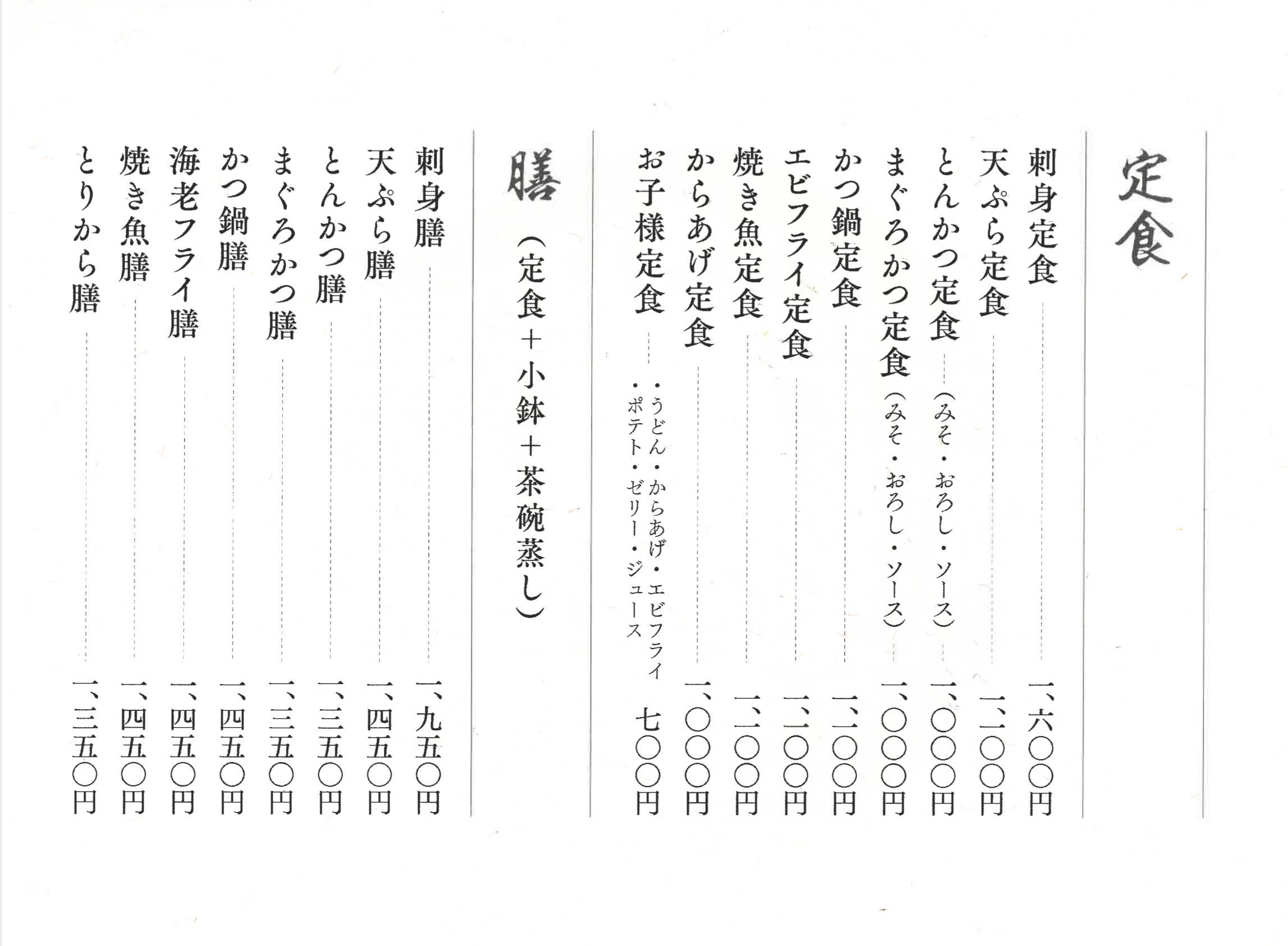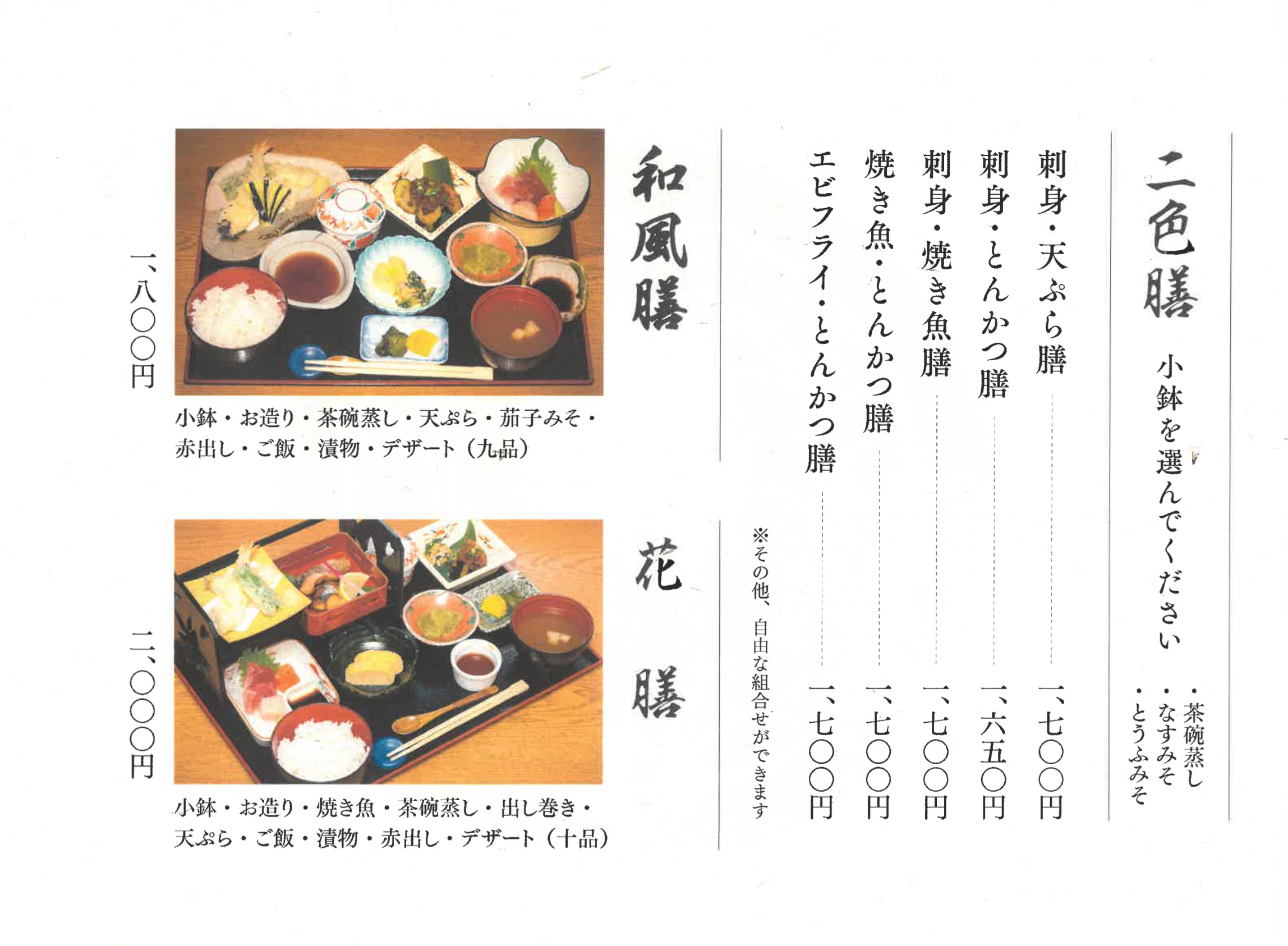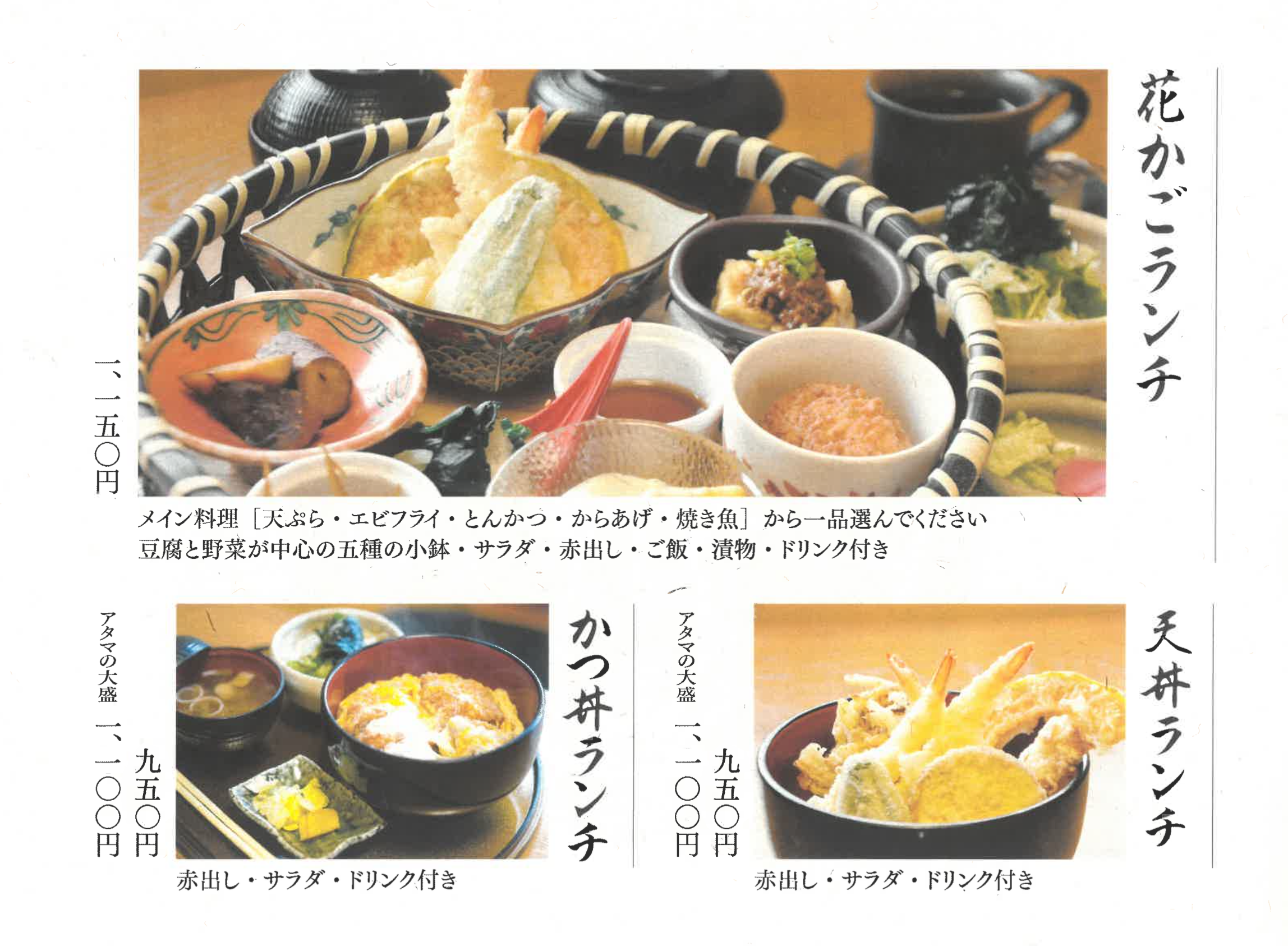 ※写真をクリックすると拡大表示します ※価格はすべて税込価格です。 夕 膳 主菜・副菜・主食から一品づつ選んでください 【主菜】天ぷら・エビフライ・とんかつ・まぐろカツ・からあげ・焼き魚 【副菜】茶碗蒸し・豆腐そぼろ味噌・なすそぼろ味噌 【主食】赤出しとご飯・ミニうどん 和風膳 小鉢・お造り・茶碗蒸し・天ぷら・茄子みそ・赤出し・ご飯・漬物・デザート(九品) 花 膳 小鉢・お造り・焼き魚・茶碗蒸し・出し巻き・天ぷら・ご飯・漬物・赤出し・デザート(十品) プリプリエビマヨ 天ぷら盛り合わせ 和牛ホルモン うま辛ラーメン あんかけカニ玉風 豆腐そぼろ味噌 チーズ揚げ盛り合わせ 洋風出し巻きトマト 出し巻きのりチーズ ひとくちデザート きまぐれデザート ジェラートデザート デザートコース English Page ▶︎
