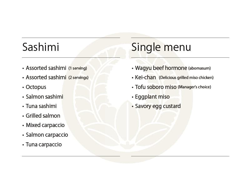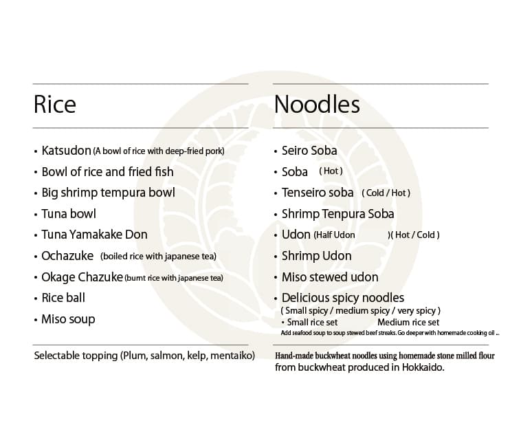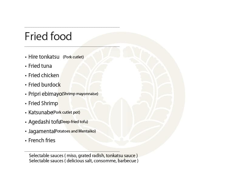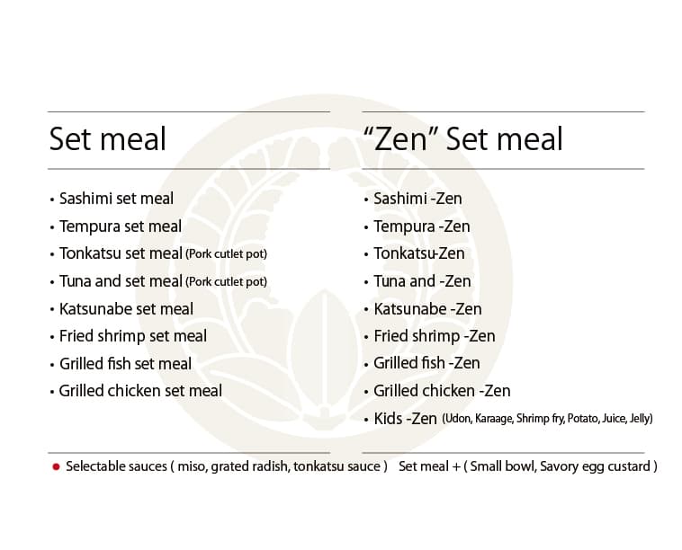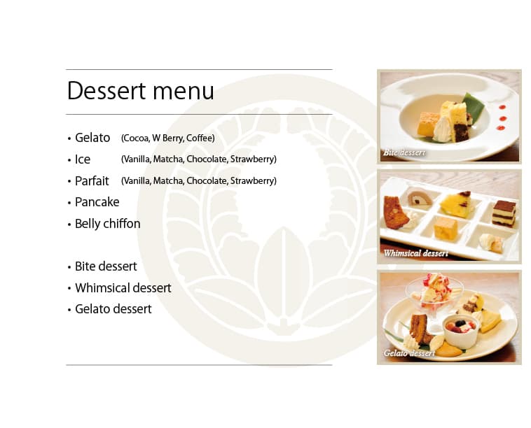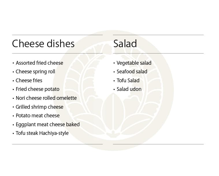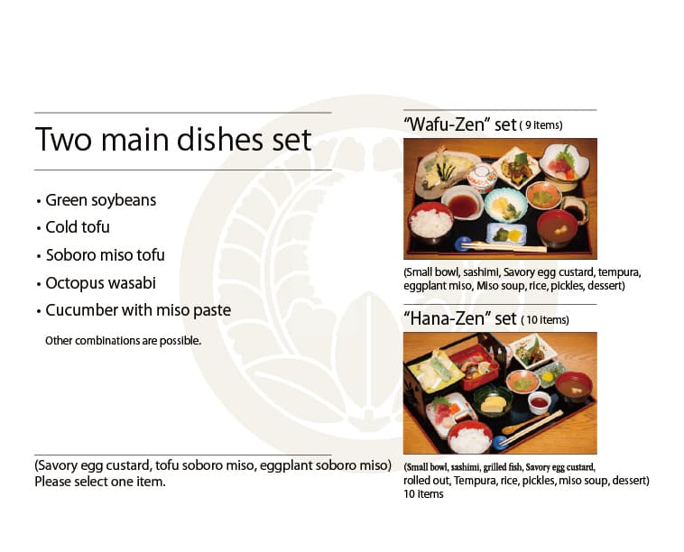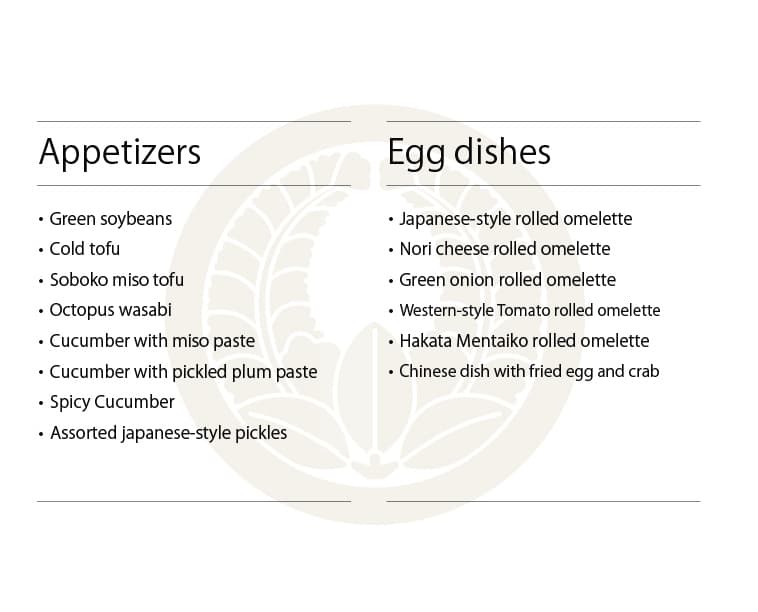 ※写真をクリックすると拡大表示します 夕 膳 主菜・副菜・主食から一品づつ選んでください 【主菜】天ぷら・エビフライ・とんかつ・まぐろカツ・からあげ・焼き魚 【副菜】茶碗蒸し・豆腐そぼろ味噌・なすそぼろ味噌 【主食】赤出しとご飯・ミニうどん 和風膳 小鉢・お造り・茶碗蒸し・天ぷら・茄子みそ・赤出し・ご飯・漬物・デザート(九品) 花 膳 小鉢・お造り・焼き魚・茶碗蒸し・出し巻き・天ぷら・ご飯・漬物・赤出し・デザート(十品) プリプリエビマヨ 天ぷら盛り合わせ 和牛ホルモン うま辛ラーメン あんかけカニ玉風 豆腐そぼろ味噌 チーズ揚げ盛り合わせ 洋風出し巻きトマト 出し巻きのりチーズ ひとくちデザート きまぐれデザート ジェラートデザート デザートコース Japanese Page ▶︎